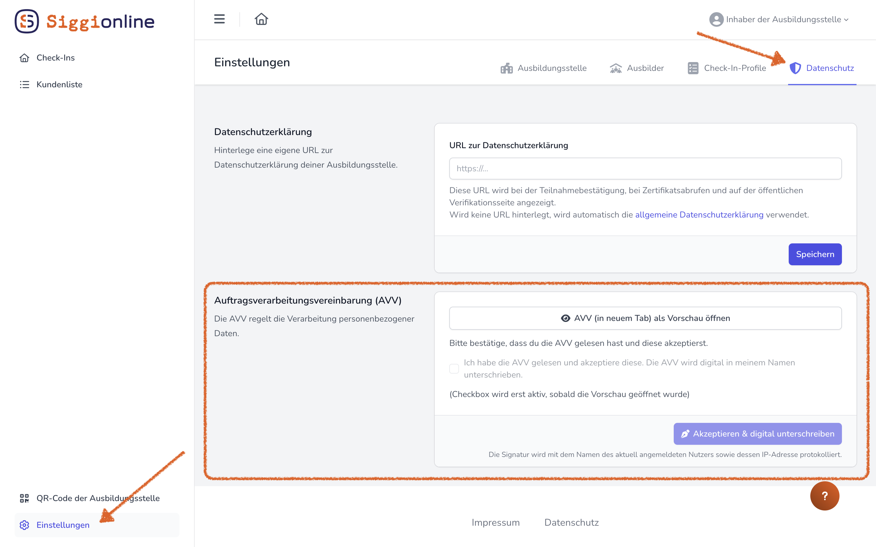Neben der AVV gehört auch die Datenschutzerklärung zu den wichtigsten Punkten, damit du Siggionline DSGVO-konform nutzen kannst.