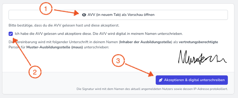 „Ich habe die AVV gelesen und akzeptiere diese. Die AVV wird digital in meinem Namen unterschrieben.“ - Bestätige die Checkbox.