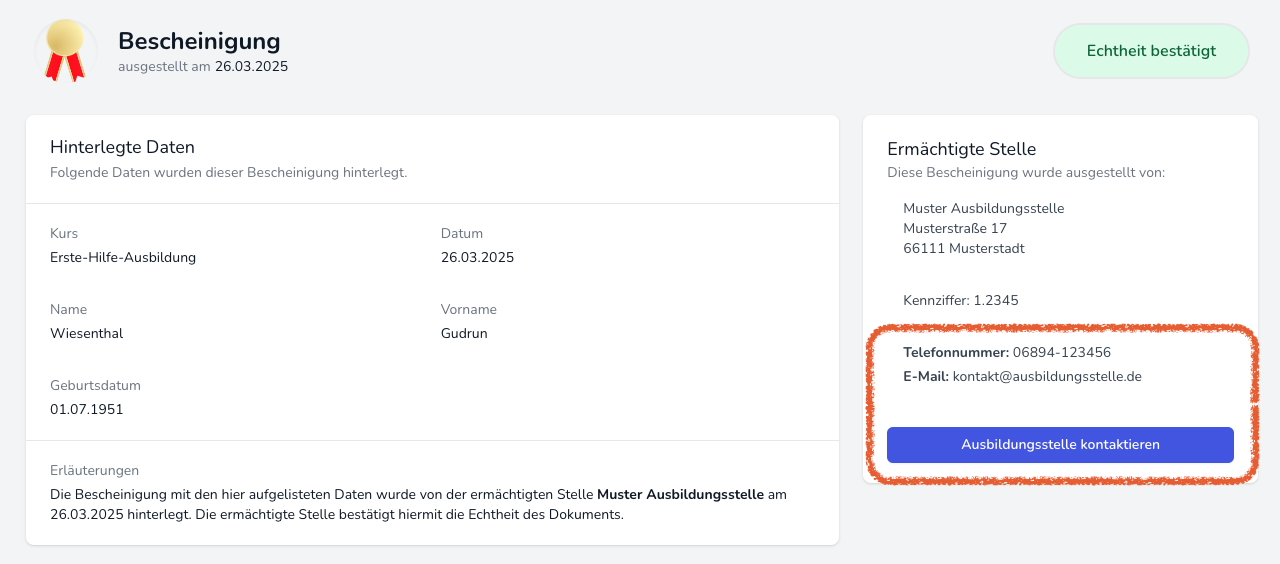 Wenn jemand ein Zertifikat scannt und überprüft, erscheinen deine hinterlegte Telefonnummer und E-Mail-Adresse in der Verifikationsansicht. So können Prüfer dich bei offenen Fragen direkt kontaktieren.